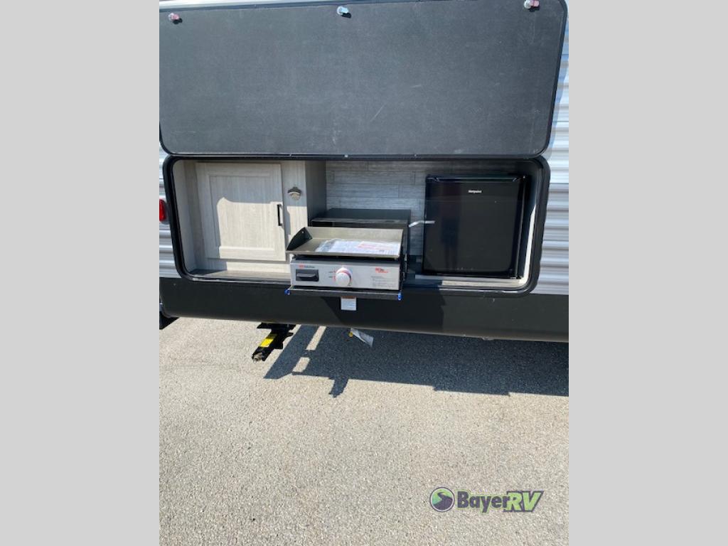 This is the perfect mid-size travel trailer for you and your family! The 46" x 74" double-size bunk beds with lower interior storage offer a comfortable sleeping space for the kids and you will have your own private sleeping space with the 60" x 74" queen bed in the front private bedroom. Freshen up each morning in the rear corner bathroom with the tub/shower and a mirror to get ready each morning. You can prepare your best home cooked meals with the GE stainless three burner cooktop and GE stainless 10.7 cu. ft. 12V refrigerator, then enjoy them together at the booth dinette. The sofa is near the entertainment center for a relaxing movie night. Don't leave any of your outdoor gear behind either thanks to the front pass-through storage area and the exterior outside storage area. You could even add the optional outside camper kitchen to grill the catch of the day on the pull out griddle!