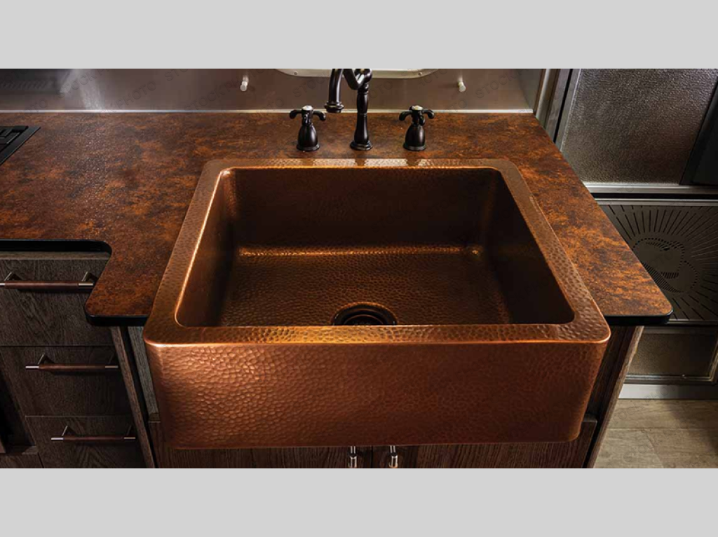 Spend your days outdoors on the ranch and your evenings indoors with all-around comfort in this travel trailer! The front bedroom includes a queen bed with a genuine leather headboard, along with underbed storage and LED reading lights. The independent shower is right across the hall from the private sink and lavatory, allowing two people to freshen up at once! You can make your best Western meals on the three-burner LP gas stove or choose the optional convection microwave oven which replaces the oven. There is also a farmhouse style hammered copper sink, a 12V refrigerator, an oak dinette table and genuine leather seating, and stylish roller shades.