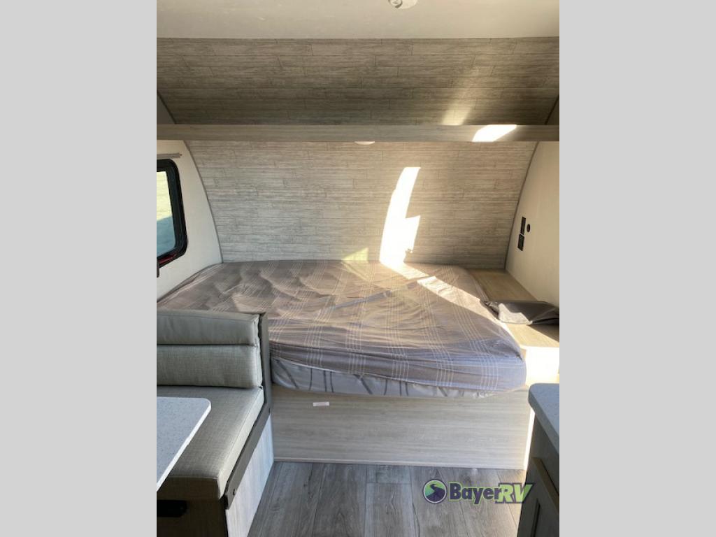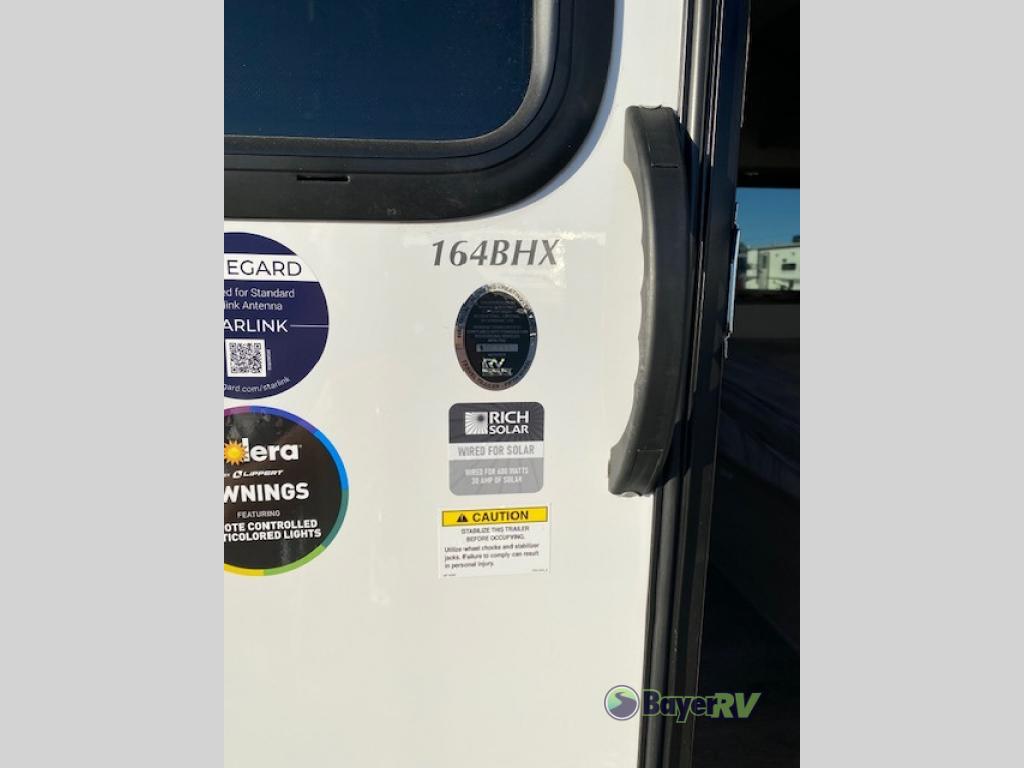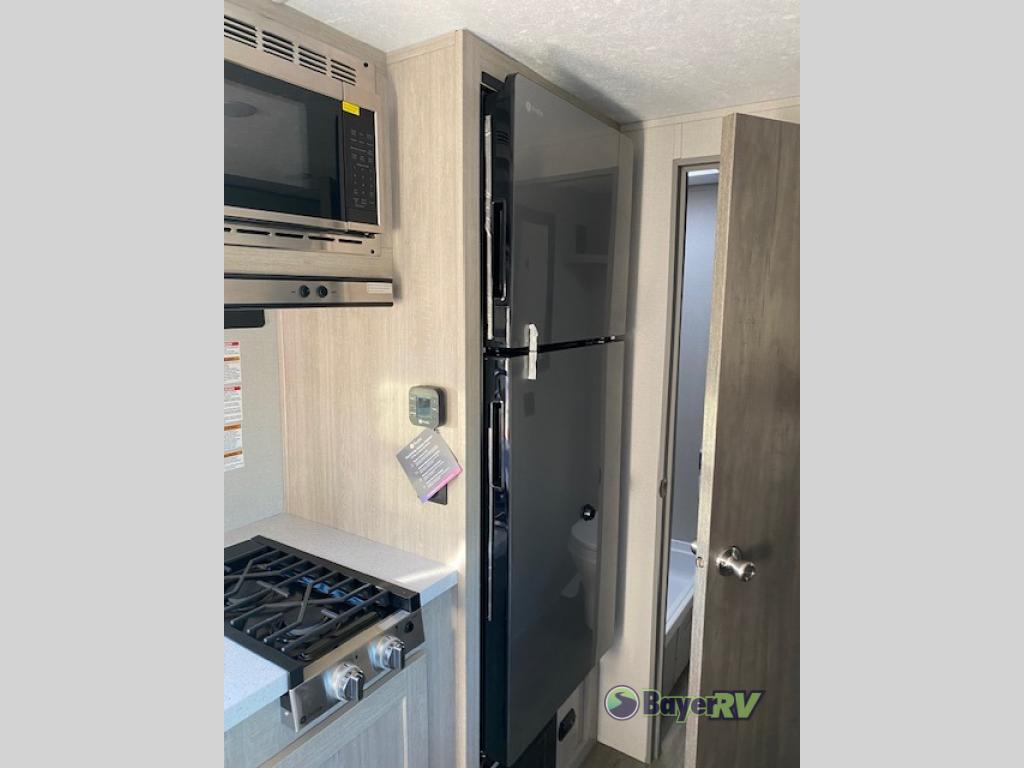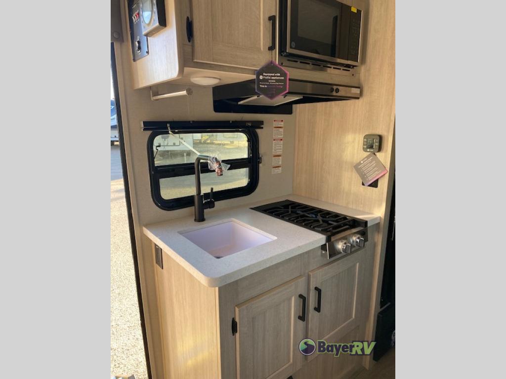 This travel trailers is perfect for a young family or smaller group. You can easily sleep four or more with the rear set of bunk beds and queen bed up front. There is also a booth dinette for inside down-time, as well as complete kitchen and bath amenities so you can cook and stay clean while traveling. The rear corner bath features a toilet and 36" x 30" shower, and it's conveniently located next to the bunk beds which is great for little ones at night. Cooking inside will be easy with a GE stainless two-burner cooktop and single sink, plus there is also a GE microwave oven for snacks and things that you can easily warm up. If you plan to spend most of your time outdoors, you will find plenty of storage space in the front exterior storage compartment, and there is also plenty of storage inside as well.