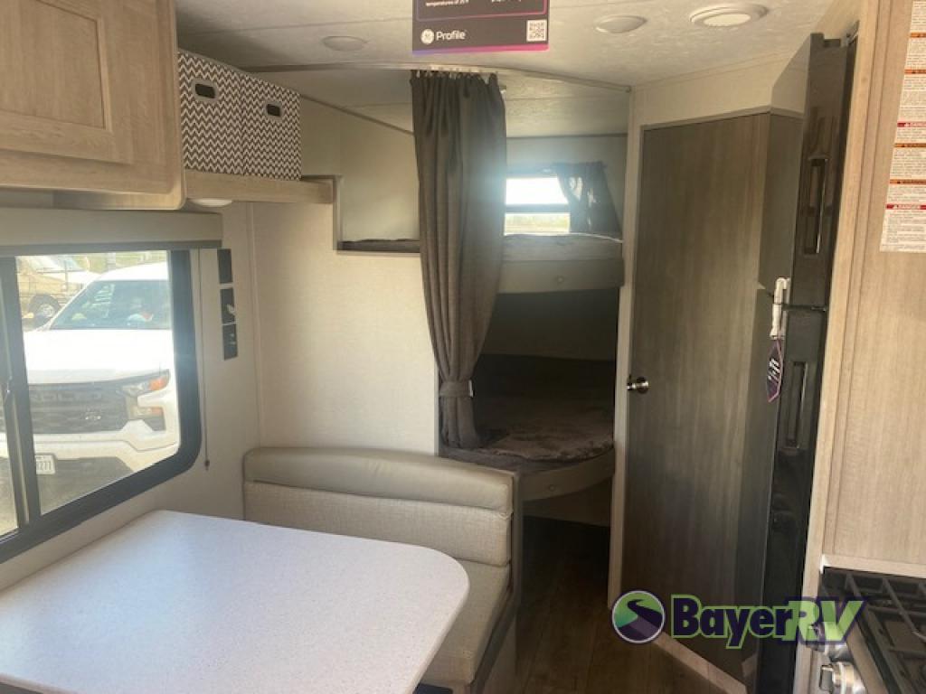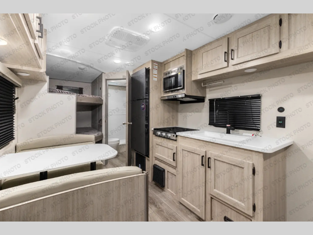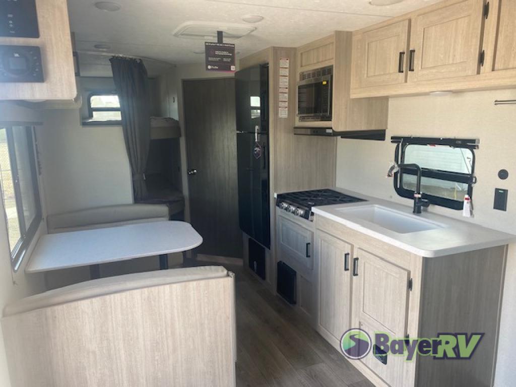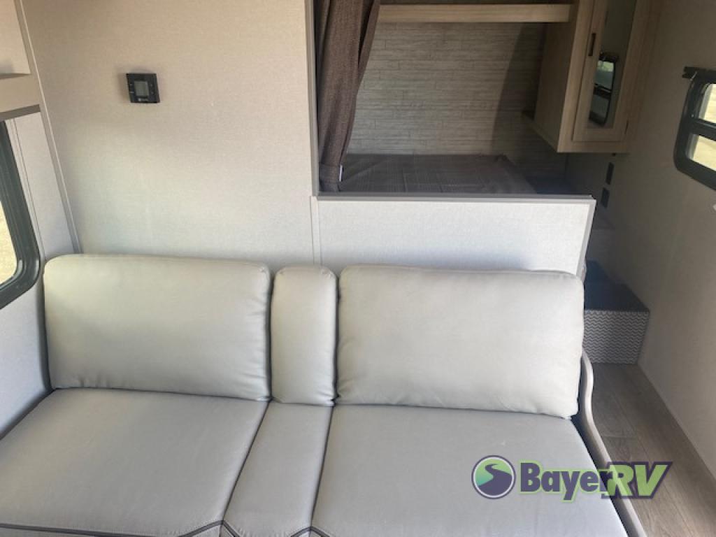 You get to choose to sit at the sofa or at the booth dinette when you are relaxing inside. There is a shelf with storage totes above the sofa for your belongings, and an additional overhead cabinet above the dinette for games. Maybe you want to rest on your own queen bed in the front semi-private bedroom before you make a meal in the kitchen or take a hike through the trails around the lake. The 15' electric awning with multi-color LED lights and a remote offers an outdoor living area where you can visit with other RVers. The kids will love their own double-size bunks that they can share with a friend or two, and the full bathroom is nearby as an added convenience.