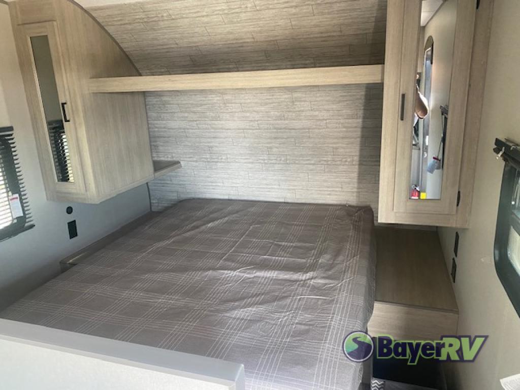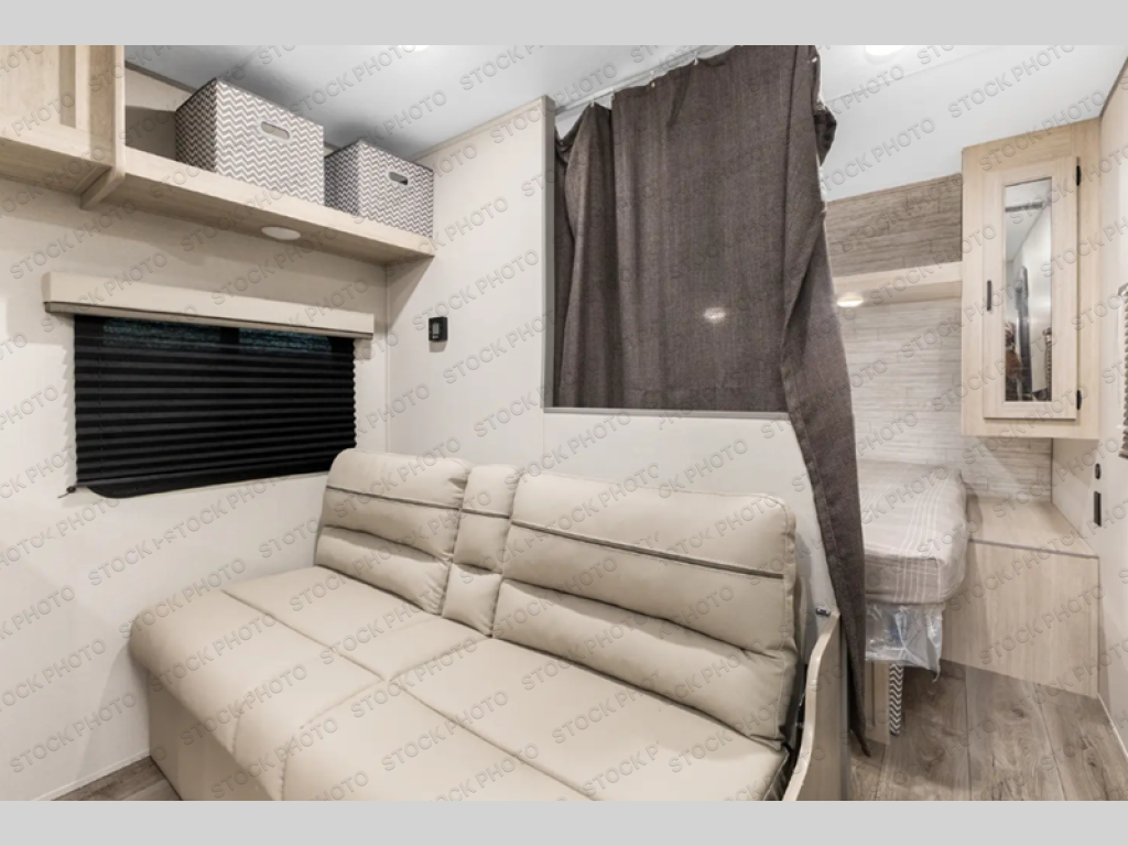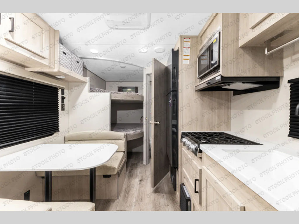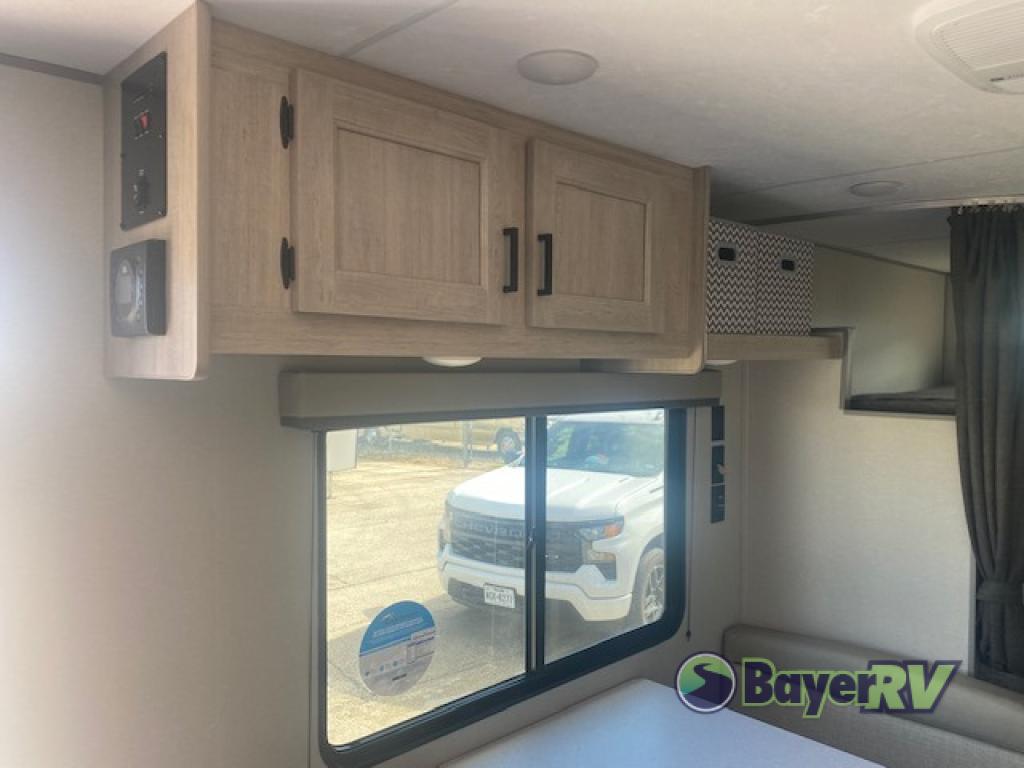 You get to choose to sit at the sofa or at the booth dinette when you are relaxing inside. There is a shelf with storage totes above the sofa for your belongings, and an additional overhead cabinet above the dinette for games. Maybe you want to rest on your own queen bed in the front semi-private bedroom before you make a meal in the kitchen or take a hike through the trails around the lake. The 15' electric awning with multi-color LED lights and a remote offers an outdoor living area where you can visit with other RVers. The kids will love their own double-size bunks that they can share with a friend or two, and the full bathroom is nearby as an added convenience.