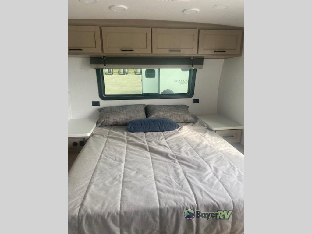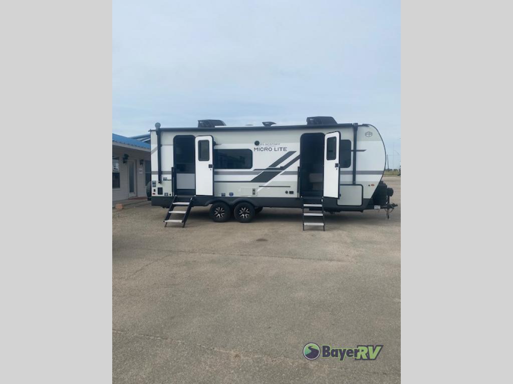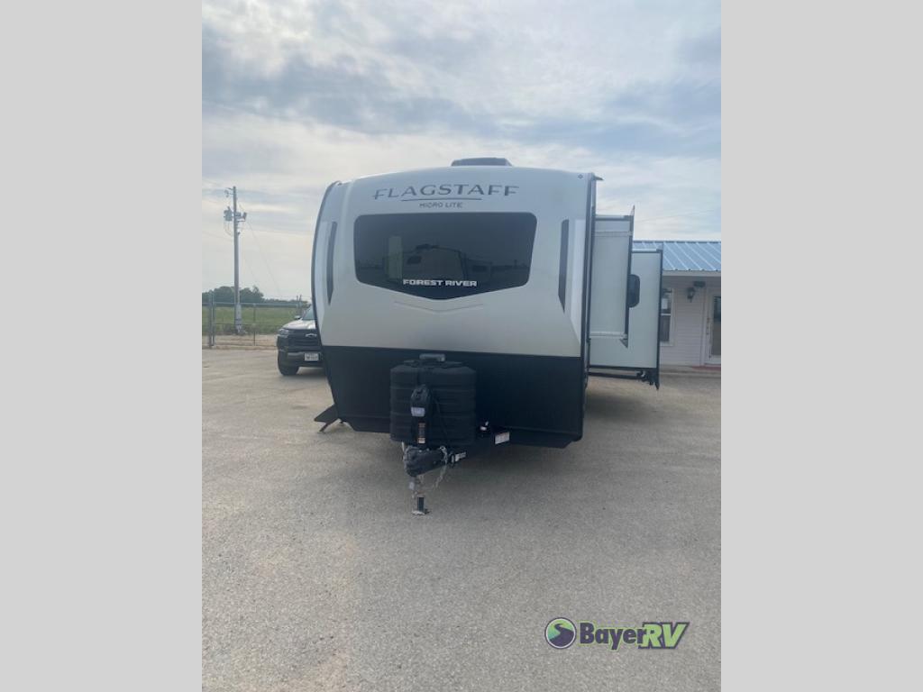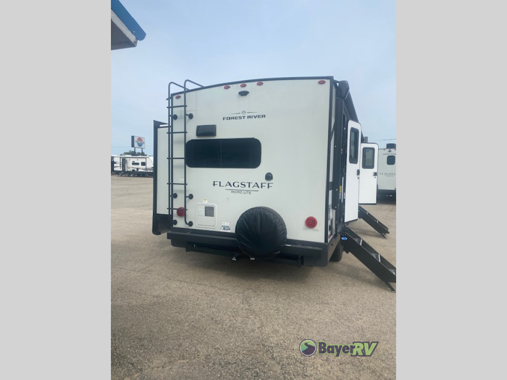 With any Flagstaff Micro Lite travel trailer by Forest River you will enjoy lightweight towing, durable construction, and added interior comforts to make each trip memorable! Each model features RoadTech tire pressure monitoring, Dexter Torflex axles, and nitrogen-filled Goodyear endurance tires for smooth towing from home to campground. The 6-sided aluminum framed construction provides a strong foundation so you can enjoy your RV for years to come, plus the radiant foil in the front cap, underbelly and slides help insulate your trailer. Additional exterior features include a 200W solar panel, back-up camera prep, frameless windows, and slam baggage doors. Each model includes the Great Expectations Package with roller shades, solid surface kitchen countertops, and hidden hinge cabinet doors. There is also an exterior hot/cold water port, outside speakers, a power tongue jack and stabilizer jacks, plus many more conveniences.