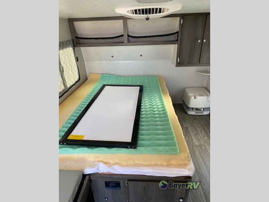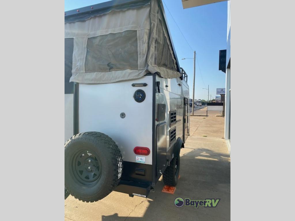 Last-minute plans to explore the outdoors can happen with this Viking Express Series folding pop-up camper! While you are headed to the campsite, you might need to get to something from inside the camper at a stop, so just use the side bike door without having to raise the roof. You and your spouse will have a full-size bed to sleep on, and the sofa might even accommodate one more person. You can make warm meals on the two-burner range, wash dishes and brush your teeth using the sink, and store leftovers in the 1.9-cubic foot refrigerator underneath.
